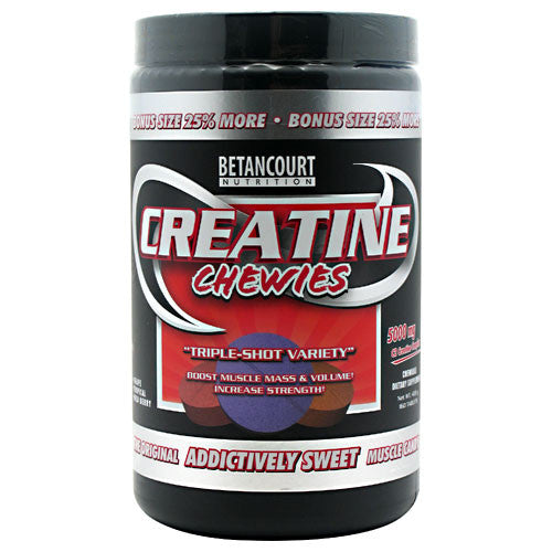Bite into the newest, most powerfully delicious form of creatine on the planet, Betancourt Nutritions Creatine Chewies. Whether its before, during, or after your workout, Creatine Chewies will be there to cheer you and your muscles on with 5000mg of highly purified C2 Creatine Complex. It begins its anabolic bodybuilding journey the instant you pop it into your mouth and sink your teeth into any one of the three fruit inspired "addictively-sweet" flavors. 5000mg of C2 Creatine Complex per Serving: More Hydrosoluble than Creatine. Formulated, Tested & Certified by Betancourts own Manufacturing Laboratory. Chewable Form for Fast Absorption. Rapidly Increase Muscle Creatine & Phosphocreatine Levels Above & Beyond what can be Achieved in the Diet Alone. Increase Muscle Hydration & Volumization. Increase Lean Mass. Reduce Body Fat Percentage. Delay Fatigue & Speed Recovery Between Sets. Increase Lifting Capacity, Strength & Power. Accelerate Recovery of Muscle Glycogen Levels. Support Plasma Volume, Brain Creatine & Phosphocreatine Levels. Increase Overall Physical & Mental Performance. Stack with BCAA & Glutamine Chewies for Greater Bodybuilding Potency. Creatine Chewies does Not Contain Any Substances Banned by the National Collegiate Sports Associations.