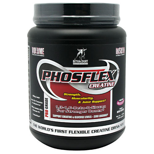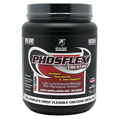 Strength, Muscularity, & Joint Support. 1,3-1,6-Beta-D-Glucan For Stronger Bones. Support Creatine & Glucose Levels- Zero Loading! 5000mg Creatine. Increase Glut-4 Translocation for Carbohydrate Use. 2000mg Chondroitin Sulfate & Glucosamine HCL. L-Leucine Nitrate. Joints: Joint Support Complex. Muscle: 3-Energy Creatine Complex. Insulin: Insulin Fuel Support Complex. Betancourt Nutrition proudly introduces the new Phosflex Creatine for athletes at the highest level of competition. Your muscles are not the only thing undergoing immense pressure when you’re at the gym; your connective tissues must also bear the load as you tear through every set. Most products only focus on boosting performance or increasing muscle mass, but how many times have your ailing joints hold you back at the gym? Whether you’re a beginner or advanced, now Phosflex is the only creatine formula designed by the physiologists at Betancourt Nutrition to simultaneously provide muscle glycogen replenishment, joint support, and unmatched increases in strength and muscle mass. Only PHOSFLEX™ contains: 3-Energy Creatine Complex: Creatine Monohydrate is the most studied and proven form of creatine. It supports ATP re-synthesis by increasing muscle levels of phosphocreatine. The addition of di-creatine malate and creatine alpha-ketoglutarate to PHOSFLEX™ takes ATP re-synthesis to another level –three levels, in fact. While creatine increases muscle phosphocreatine levels, malate and alpha-ketoglutarate support the function of the tricarboxylic acid (TCA) cycle, a metabolic pathway involved in the re-synthesis of ATP. Glucose Polymers: GPs are possibly the fastest-acting, purest way to deliver glucose to your body. They can be digested and absorbed very quickly, making them ideal for fast recovery of glycogen levels post-workout. Waxy Maize: Derived from corn, WM is a slowly digesting, low-GI carb. It raises blood glucose levels gradually, which means that they come down gradually, too. This makes WM ideal for long, heavy workouts and individuals who have experienced sugar “crashes” with other carbs. Leucine Nitrate: The branched-chain amino acid (BCAA) leucine turns on “switches” inside your muscle cells that allow rates of muscle protein synthesis to increase after resistance exercise. The nitrate attached to leucine can be converted into nitric oxide (NO), a potent vasodilator and regulator of muscle blood flow. Banaba Leaf Powder Extract: Banaba (Lagerstroemia speciosa) contains corosolic acid (CA), a pentacyclic triterpene that supports glucose levels in the healthy range. Though its mechanism of action is unclear, studies suggest that it can increase glucose uptake in muscle cells, thereby supporting recovery. CA has even been shown to have anabolic (building) effects on bone. (1,3)(1,6) Beta-D-Glucan Powder: BDG is a naturally-occurring insoluble carbohydrate. Animal studies suggest that BDG is a potent immune system modulator that may reduce inflammation, a common symptom of heavy training. Glycerol Monostearate: Inside the body, GM releases glycerol. Glycerol is hydroscopic, which means that it draws water around itself. When glycerol accumulates inside muscle and joint tissues, it hydrates and volumizes them, which provides hydraulic support. L-Tyrosine: Tyrosine is a precursor to neurotransmitters involved in the regulation of mood. Supplementation with tyrosine appears to be most helpful under conditions of mental stress. Potassium Bicarbonate: PB supplies the essential electrolyte potassium and helps buffer acid produced in muscle during high-intensity exercise.