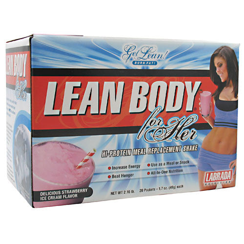 Easy-to-use packets! Delicious taste! Makes a delicious creamy shake! 30g Protein per serving! Use as a meal or snack; Aspartame-free; High calcium; Low fat. Lean Body for Her is rich in the nutrients women need to get into great shape and achieve optimum health! Lean Body for Her is high in protein, ideal for low carb diets and is fortified with soy protein, folic acid, and essential vitamins and minerals. Use it twice daily as a meal replacement, or as a treat between meals. Lean Body for Her is a delicious, nutritious shake that can help you achieve your self-improvement goals! Who should use Lean Body for Her? Women of all ages desire to tone lean muscle, burn unwanted fat and reduce inches from their hips, thighs, and buttocks. Lean Body for Her works best when used in conjunction with a low calorie diet and exercise. What can Lean Body for Her for me? Lean Body for Her is a unique meal replacement powder formulated specifically for womens nutritional needs. It is high in the nutrients that an active woman needs to get into great shape and achieve optimum health. It contains the nutritional insurance you need when you are dieting and losing fat. Is Lean Body for Her easy to use? Yes! Lean Body for Her comes in convenient, serving size packets that fit easily into your purse, briefcase, or gym bag. Whenever you want a fast, delicious and nutritious meal or snack, just tear open the packet and mix cold water, skim milk, or juice. How should I use Lean Body for Her? Lean Body for Her should be used twice per day as a meal replacement or as a treat in between meals. How does Lean Body for Her work? Lean Body for Her contains a combination of healthy ingredients that work together synergistically to provide nutritional support for lean muscle tissue, fat loss, and increasing energy. Heres what you get in every packet of Lean Body for Her: 30 grams of high-quality protein. Protein is necessary for the maintenance and repair of lean muscle tissue, the very tissue responsible for helping you look fit, trim, and shapely. Contains a precise blend of heart-healthy soy protein and highly bio-available whey protein isolate-to help feed lean muscle tissue with the nutrients necessary to maintain a fast, fat-burning metabolism. If you are weight-training ad doing cardio several times a week to get leaner, you will need to consume adequate amounts of protein to achieve your goals. Only 9 grams of carbs, Controlling carbohydrate consumption can help you burn stubborn body fat by helping you keep insulin (a powerful fat storage hormone) levels low. Bone Supporting Nutrients. Bone health is especially important for women, as osteoporosis is five more common in women than men. Contains soy isoflavones, which are plant compounds with chemical structures similar to estrogen. These isoflavones have a positive effect on bone health and bone loss. Contains 40% the Daily Value or 400 mg of calcium. The National Institutes of Health recommends women consume 1,000 mg of calcium each day to help prevent osteoporosis. Folic acid is a B vitamin that helps the body make healthy new cells. Folic acid has benefits for women of all ages. Studies show that folic acid may help in the prevention of heart disease, stroke, some cancers, and Alzheimers disease. One serving of Lean Body for Her contains a third of the government recommended dose of folic acid. Iron is essential to making healthy red blood cells and carrying oxygen to the bodys tissues. Iron deficiency anemia is common in women. According to the Mayo Clinic, one in five women and half of all pregnant women are iron deficient. Lean Body for Her contains 25% of the RDA for iron. Glutamine is an amino acid with a super-unique role: it can be utilized by the body as a fuel, used for a new body protein, and make other important compounds and amino acids. The good news is that recent studies show that supplemental glutamine helps prevent muscle breakdown. Lean Body for Her contains over 7,500 mg of Glutamine & Glutamic Acid. Antioxidants including Vitamins C and E to help protect your body against free radicals and B Vitamins for proper metabolism of protein and fat, and to help support nerve and brain function.