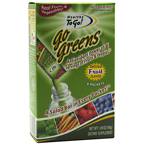 Real fruits & vegetables. Add to bottled water. No sugar added. Antioxidant power of 6 servings of fruits & veggies (Based on ORAC value of 1 serving each of bananas, broccoli, cantaloupe, tomatoes, lettuce and carrots combined.) A salad bar in every packet! Compare antioxidant power. 1 Serving of Go Greens has greater antioxidant power than one serving of each of the following 4 fruits and vegetables combined! ORAC, short for Oxygen Radical Absorbance Capacity, measures the total Antioxidant Power of foods. Antioxidants disarm oxygen free radicals. These free radicals harm healthy cells, accelerating aging throughout the body. The more harmful free radicals a food can absorb, the higher its Antioxidant Power and ORAC score. (ORAC values of fruit and vegetables sourced from the Journal of Agricultural and Food Chemistry.) Natox: natures antioxidants. Waters new best friend! Health-conscious consumers eat 5 to 9 servings of fruits and vegetables every day. Busy people drink them! 1 Serving of Go Greens has the antioxidant power of 6 servings of selected fruits and vegetables. Tear open, pour into cold water, and enjoy our natural, great-tasting greens packed with over 40 fruits, vegetables, herbs and spices in each serving. Antioxidant-packed Go Greens, great for those of you wishing to carry your fruits and vegetables with you, wherever you may roam! Just rip, pour, go! With each seasons harvest, the taste of the pure and natural ingredients in Go Greens will vary slightly. Certified organic by QAI. Quality Assurance International. (These statements have not been evaluated by the Food and Drug Administration. This product is not intended to diagnose, treat, cure or prevent any disease). Manufactured in the USA.---Natures Greens Blend: Barley Grass Juice (Certified Organic Ingredients), Chlorella. Natures Antioxidant Blend: Isoquercitrin/Rutin, Aloe Vera Extract (Certified Organic Ingredients), Marigold Extract (10% Lutein with Zeaxanthin), Cinnamon Bark (Certified Organic Ingredients), Cinnamon Extract (Certified Organic Ingredients), Blueberry, Green Tea Extract, Grape Seed Extract, Cranberry (High Active Concentrate), Raspberry, Tart Cherry, Pine Bark Extract, Broccoli (High Active Concentrate), Tomato, Carrot (High Active Concentrate), Spinach (High Active Concentrate), Kale (High Active Concentrate), Brussels Sprout, Bilberry, Elderberry, Pomegranate, Blackberry. Natures Garden Blend: Apple (Certified Organic Ingredients), Lemon (Certified Organic Ingredients), Carrot (Certified Organic Ingredients), Spinach (Certified Organic Ingredients), Quinoa Sprout (Certified Organic Ingredients), Peach (Certified Organic Ingredients), Kale (Certified Organic Ingredients), Broccoli (Certified Organic Ingredients), Acai (Certified Organic Ingredients), Cranberry (Certified Organic Ingredients). Natures Super Fruits: Acerola Cherry Extract (Certified Organic Ingredients), Apple Extract (Certified Organic Ingredients), Pomegranate Extract, Mangosteen Extract, Acai Extract (Certified Organic Ingredients). Natures Fiber Blend: Rice Bran Soluble (Certified Organic Ingredients), Oat Beta Glucan (Certified Organic Ingredients). Natures Sea Vegetables: Dunaliella Salina, Atlantic Kelp (Certified Organic Ingredients). Natures Super Tea Blend: Green Tea Extract (Certified Organic Ingredients), White Tea Extract (Certified Organic Ingredients). Lecithin. SteviaLite (Stevia Rebaudiana).