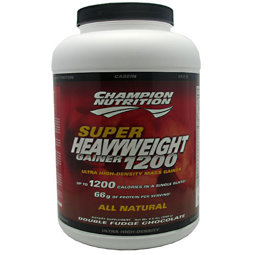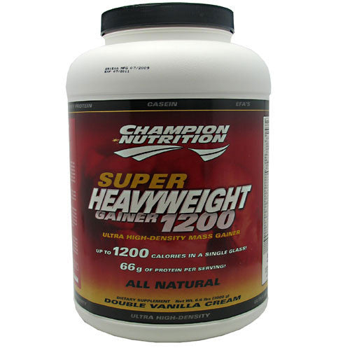 All natural. Up to 1200 calories in a single glass! 66g of Protein per serving! Champion Nutrition defines the state-of-the-art in Gainers once again. At 1200 calories per glass, Super Heavyweight Gainer has more calories and protein (up to 66 grams) per glass (refers to a 20 oz glass) than any gainer ever! Its irresistible flavors utilize a new technology we call, Double-Melted-Ice-Cream. To Gain Mass You Need Lots and Lots of Calories! In fact nothing else will work without calories! The athletes that discover this are the ones that gain the mass. The rest dont. You May Need 6000 Calories A Day to Gain the Kind of Mass You Want. Too Many Athletes Struggle on Less Than Half This Number! Lets do the math. If you eat just three regular meals a day at 900 calories each, and add three SHWG (refers to Super HeavyWeight Gainer) shakes at 3600 calories, youve just taken in a whopping 6300 calories! No bloat-No Problem. No Other Gainers Has What Super HeavyWeight Has! Packed with vitamins and minerals, protein, and even fiber to keep everything working right. SHWG is the finest and most advanced gainer on the planet, bar none! Plus SHWG contains these ingredients to help control fat: Citrimax (Hydroxycitrate)-To help reduce the amount of carbohydrate that gets converted to control fat; Chromium-To help drive aminos and carbs into muscle tissue where they can give you massive size without fat; MCTs (Medium Chain Triglycerides)-Give you energy to recover fast with less conversion to fat. Use SHWG Up to 3 Times a Day: Mid-Morning-Have your first shake before lunch. Dont go more than 2.5 hours without a quality high calorie meal (with at least 50 grams of protein) to maximize muscle gains. Keep your body saturated with calories and you will maximize gains. Otherwise, you may be chewing-up precious muscle for energy.; Pre-Workout-1 to 1.5 hours before training, drink SHWG to guarantee you get the most powerful workout possible without cannibalizing muscle for energy; Post-Workout-Have another delicious SHWG shake immediately after training to feed your hungry muscles. This is when your muscles may take in as much as 85% of the nutrients they will use over the next 24 hours for growth and recovery! Miss this and you may miss the boat for muscle growth. More Calories, Less Saturated Fat! Each serving of SHWG gives you more fat calories than one 20 oz premium ice cream milkshake, yet it contains less saturated fat-48% less saturated fat. Plus Super Heavyweight Gainer is fortified and it contains essential fatty acids. So if you want calories, SHWG gives them to you, the right way! For muscle-building, this product is intended to be used in conjunction with a safe and intense program of physical exercise. (These statements have not been evaluated by the Food and Drug Administration. This product is not intended to diagnose, treat, cure or prevent any disease.)