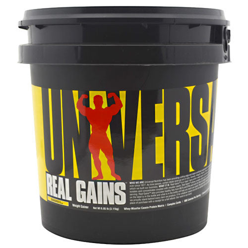 Weight Gainer. Whey-Micellar Casein Protein Matrix. Complex Carbs. 600+ Calories Per Serving. Enhanced with Inulin & Flaxseed Oil. Who We Are: Universal Nutrition has been providing cutting edge and staple nutritional supplements to bodybuilders and hard training athletes the world over since 1977. As time passes, certain ideals never go out of style. Honesty. Integrity. Respect. These are the values we uphold and are the bedrock upon which we built our business. What It Is: Real Gains is a "clean" high protein weight gainer providing fast and slow protein sources in the form of whey isolates and concentrates coupled with micellar casein. Real Gains utilizes complex carbs as its primary calories source with as low as 7g of sugar per serving. Real Gains also provides healthy fats from MCTs and EFAs and inulin for fiber in a single, nutrient dense serving. How We Back It UP: What is on the label is in the bottle and what is in the bottle will help you reach your goals. We guarantee it. Backed by our 100% ironclad money back guarantee, we proudly stand behind every item we produce. If for whatever reason you are not satisfied with any product bearing our name, simply return it to your place of purchase with a receipt for a full refund. Our word is our bond. Typical Amino Acid Profile (per 100g of Protein): L-Alanine, 4.59g; L-Arginine, 2.23g; L-Aspartic Acid, 10.04g; L-Cystine, 2.35g; L-Glutamic Acid, 11.53g; L-Glutamine, 4.46g; L-Glycine, 1.74g; L-Histidine, 1.86 ; L-Isoleucine, 5.83g; L-Leucine, 10.29g; L-Lysine, 8.55g; L-Methionine, 1.98g; L-Phenylalanie, 3.22g; L-Proline, 5.21g; L-Serine, 4.46g; L-Threonine, 6.07g; L-Tryptophan, 1.61g; L-Tyrosine, 2.85g; L-Valine, 5.46g. Made Proudly in the USA.