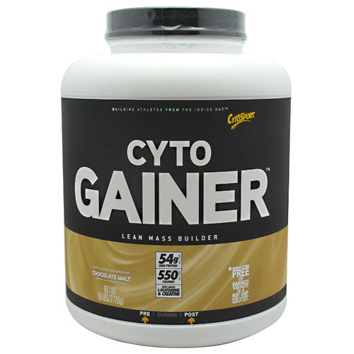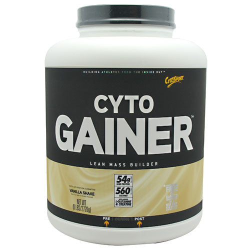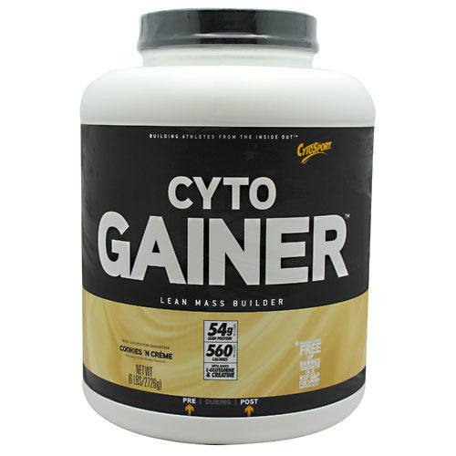 DENSE, FULL, HARD MUSCLE requires primarily 3 things: 1. PROTEIN-Quality aminos and lots of them. 2. CARBS - Complex, quality carbs, and lots of them, too! 3. A LOT OF HARD WORK If youve ever had trouble really growing, or had trouble maintaining your hard-earned size, this product was designed specifically for you. CytoGainer gives you large portions of protein and carbohydrates, without the fat and sugar. 54 Grams of Complete Protein CytoGainer contains glutamine-rich whey, milk protein concentrate and partially pre-digested whey peptides for improved protein synthesis. Each serving also contains added Creatine and L-Glutamine to help maximize muscle recovery growth. HOW ABOUT THE CARBS? With no simple sugars, no fructose, and no sucrose, CytoGainer contains complex carbohydrates from maltodextrin to replenish muscle and liver glycogen after your workout so you can fully recover and grow! CytoGainer provides a stable and enduring fuel, enhanced to drive growth nutrients into your thirsty muscles! Since we founded CytoSport in 1998, weve been dedicated to working with sports scientists, coaches and trainers to redefine protein enhanced products for active lifestyles and serious athletes-supporting performance when it matters. Over the years, weve expanded to create a comprehensive line that encompasses the athletic experience from preparation, to hydration, to recovery. Our products are among the very few that are manufactured in a NSF International GMP for Sport Registered facility. Our facilities are also inspected and regulated by the FDA. We carefully manufacture our powder products and ready-to-drink pre-blends onsite at our corporate campus in Benicia, California. Making efficacious products for athletes and active lifestyle individuals requires responsibility on all fronts. As our business has grown, so has our footprint. We have made environmental sustainability a focus and driver in everyday decision making. For more, please visit our website. Through it all, CytoSport has been committed to one thing, building athletes from the inside out. Greg and Mike Pickett, Father/Son. 54g Lean Protein. 550 Calories. With Added L-Glutamine & Creatine.