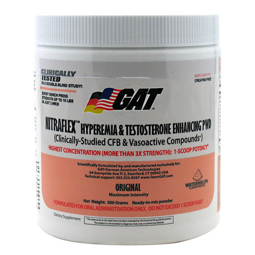 Hyperemia & Testosterone Enhancing PWD (Clinically-Studied CFB & Vasoactive Compounds). Highest Concentration (More than 3x Strength): 1-Scoop Potency. Reactive hyperemia describes the increase in muscle blood flow that occurs during high-intensity resistance exercise and produces the "pump" associated with increases in muscle size. The Nitraflex pretraining formula contains ingredients that in vitro, animal and clinical studies suggest possess properties that may help advanced athletes maximize energy, intensity, vascularity and reactive hyperemia (pumps) during their workouts, and provide long-term support of testosterone and nitric oxide levels in the healthy range when used as directed. Unique Properties of some of the key compounds in Nitraflex: 1-Scoop Potency: Nitraflex is so potent, only 1 scoop (1 serving) is necessary. Do not exceed 1 scoop in a single 24-hour period. Do not take Nitraflex with 5 hours of bedtime. High Citrulline: Arginine Ratio: Arginine is a proven precursor in nitric oxide (NO), a vasodialator. What most people dont know is that Arginine supplementation stimulates the activity of arginase, an enzyme that breaks down Arginine. Over time, this may actually result in reduced Arginine and NO levels in turn causing your preworkout formula to stop working. Research suggests that supplementing with a high ration of citrulline to Arginine may reduce this risk by avoiding overstimulation of arginase. 6 Weeks of Testosterone: Calcium fructopyranose borate (CFB) has been shown to increase testosterone in health subjects. The average increase in total and free testosterone in a 6-week study was 56% and 29.5% respectively. In a second study, total and free testosterone increased on 3 hours after a single dose of CFB. Effective Doses of Beta-Alanine: The clinically-proven performance enhancer beta-alanine was not "fairy dusted" in this formula. Rather, we added an exceptionally powerful does that you will feel working following your very first serving. Creatine-Free: Creatine causes water retention, which can make achieving a dry, hard muscular look even more difficult. Sometimes creatine is added to products precisely for this reason. (When you see yourself getting bloated, you may be fooled into thinking the product is "working.") We left it out of Nitraflex precisely for this reason. Cognitive Enhancers: Nitraflex contains unique ratios of scientifically validated compounds that help you remain alert, intense and focused while youre flying from set to set with veins fully dialated and muscles pumped to the hilt.