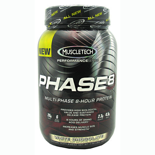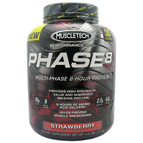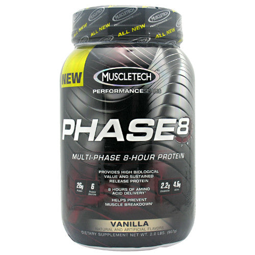 Provides high biological value and sustained release protein. 8 hours of amino acid delivery. Helps prevent muscle breakdown. 26g PROTEIN. 6 Protein Sources. 2.2g GLUTAMINE. 4.6g BCAAs. If youre serious about performance and results, you need the ALL-NEW MuscleTech Performance Series! NO PROPRIETARY BLENDS. NO FILLERS. NO UNDERDOSED KEY INGREDIENTS. NO HYPE. NO BANNED SUBSTANCES. NO EXCEPTIONS. PHASE8 is designed to do one thing - feed your muscles the highest quality blend of protein available. Each serving of PHASE8 delivers a 26-gram blend of proteins taken from multiple sources with variable digestion rates. The multiple release rates of amino acids feeds your muscles for 8 hours - thats prolonged delivery of key muscle building blocks, making PHASE8 the perfect protein for any time of the day - or night.