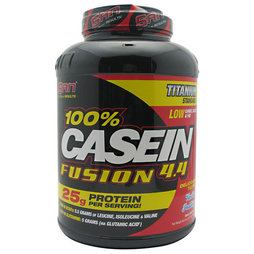Titanium Standard. Low carbs, sugar & fat. Delicious taste! High in BCAAs: 5.5 grams of leucine, isoleucine & valine. Rich in glutamine: 5 grams (via glutamic acid).25 grams of slow digesting, controlled dispersed protein matrix consisting of micellar casein & milk protein concentrate. Nearly 5.5 grams of BCAAs (leucine, isoleucine, valine) per serving. 5 grams of glutamine (via glutamic acid) in every serving. High in EFAs such as sunflower oil. Very low in carbohydrates, sugar & fat. Optimal nighttime protein or in between meals. Amazing taste, texture and aroma that is unsurpassed. 100% Casein Fusion is one of the most sophisticated casein proteins in existence today. Its special formulation is what sets 100% Casein Fusion apart from the other time released protein blends on the market today. Faster digesting proteins such as whey are preferred immediately post workout, however, slow digestion and absorption (such as with 100% Casein Fusion) may be more beneficial during times of rest (nighttime) when the body typically does without nourishment for 6-8 hours. 100% Casein Fusion only contains micellar casein (alpha & beta & gamma) and complete milk protein concentrate (rich in lactoferrin) which are acid sensitive and thus thicken in the stomach forming a gel like liner and in turn slowing down the absorption. It generally takes twice as long (whenever compared to whey) for the digestive system to break up casein into its amino acid counterparts. 100% Casein Fusion is often mixed with oatmeal and fruits for added quality calories and for individuals with extremely high metabolisms or goals that revolve around bodybuilding, endurance and/or strength sports. Its incredibly versatile formulation allows 100% Casein Fusion to be added to any low carbohydrate diets or as part of a mass building program by supplying the user with added quality via a sustained released protein matrix. Designed to take the guesswork out of your daily nutrition. 100% Casein Fusion represents nutrition for the next millennium! Its taste, texture and aroma are unsurpassed by any other nutrition formula currently available. In fact, its taste can be accurately described as mouth-wateringly delicious. You will literally look forward to each and every shake.