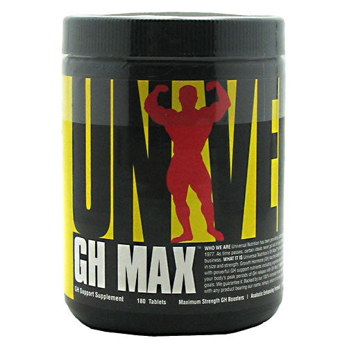 Universal GH Max. GH Support Supplement. Maximum Strength GH Boosters. Anabolic Enhancing Formula. Arginine AKG. Ornitine HCI. Maximum Results. What It Is. Universal Nutritions GH Max is the ultimate GH-Support formula for the serious bodybuilder or powerlifter who is interested in extreme gains in size and strength. Growth Hormone (GH) has the ability to increase lean mass by stimulating protein synthesis and increasing nitrogen retention in muscles. Designed with powerful GH support nutrients including arginine and ornithine plus extra anabolic nutrients , maximum strength GH Max helps in your quest for size. Target your bodys peak periods of GH release with GH Max. How We Back It Up. What is on the label is in the box and what is in the box will help you reach your goals. We guarantee it. Backed by our 100% ironclad money back guarantee, we proudly stand behind every item we produce. If for whatever reason you are not satisfied with any product bearing our name, simply return it to your place of purchase with a receipt for a full refund. Our word is our bond. (These statements have not been evaluated by the FDA. This product is not intended to diagnose, treat, cure or prevent any disease.)
